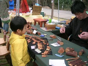 チビッコはヒノキを彫って作った小さなギターに釘付け!!